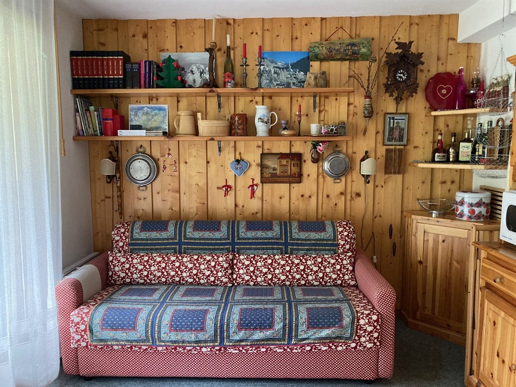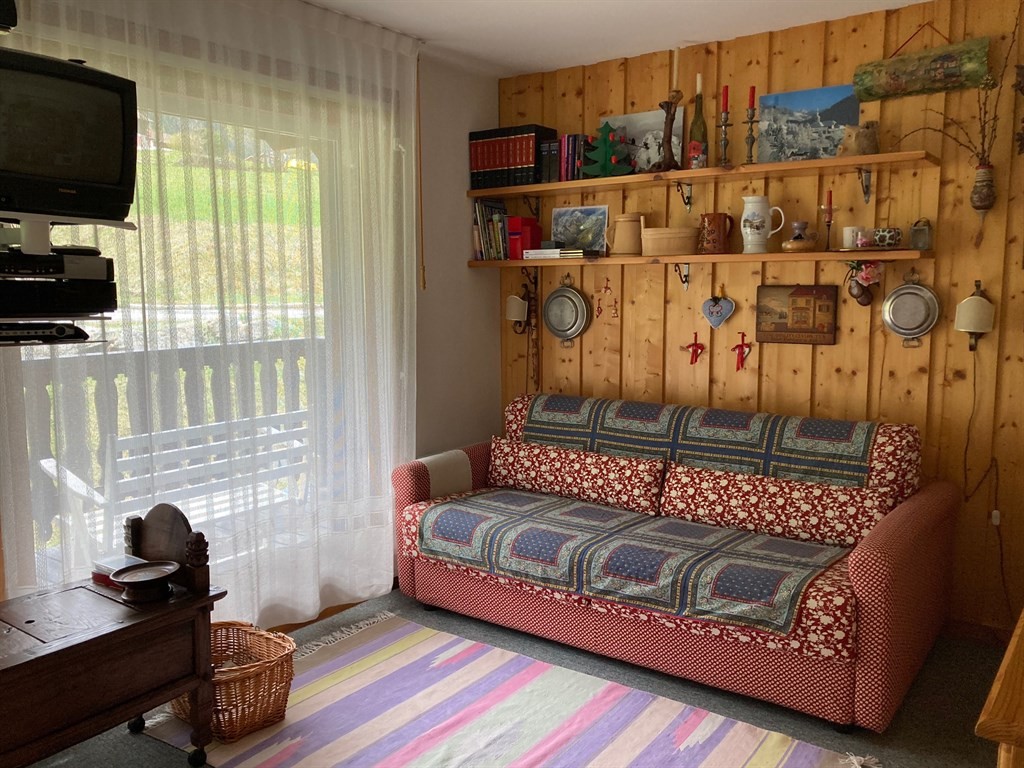 Al primo piano senza ascensore, si compone di zona giorno con divano letto e angolo cottura - ampiamente finestrata con vista panoramica e accesso al terrazzo - camera matrimoniale con 2 posti letto, cameretta con 1-2 posti letto, bagno con doccia, bidet e lavatrice, locale wc separato, ampio balcone coperto con vista rilassante su prati, boschi e cime innevate. Tutti i locali sono finestrati.